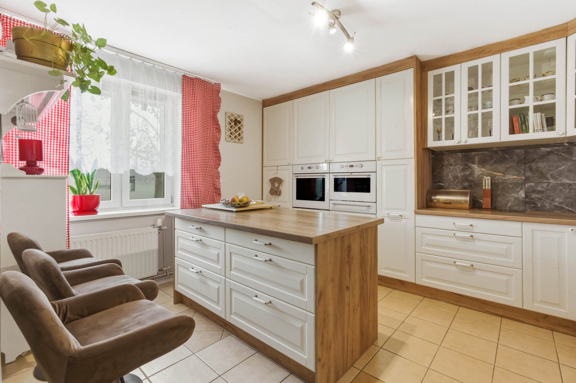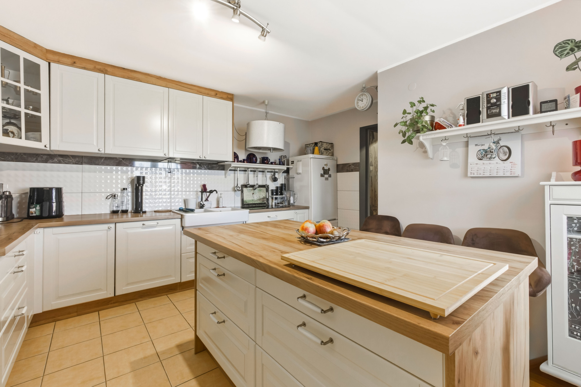 Living room (26 m²): A spacious lounge featuring a charming fireplace. Kitchen (18 m²): Custom-made and fully equipped with built-in appliances (dishwasher, oven, microwave). Modern design combined with a large kitchen island. Bedroom I (19 m²): With north and west-facing windows. Bedroom II (23 m²): A large room with a west-facing window. Bathroom (4 m²): Equipped with a shower and a low-profile tray. WC (2 m²): Separate toilet. Pantry (5 m²): Practical kitchen storage with direct access to the